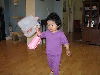 Noelle "helping" me get the diaper bag ready to go by stuffing it with all her favorite toys